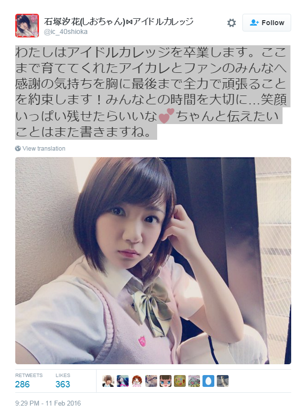 เมื่อวันที่ 11/2 Shioka ได้ ประกาศ บอกทาง twiter ว่าจะจบการศึกษา